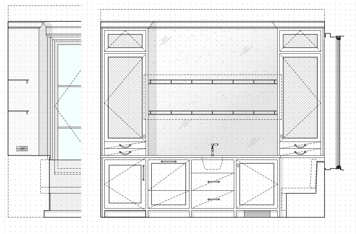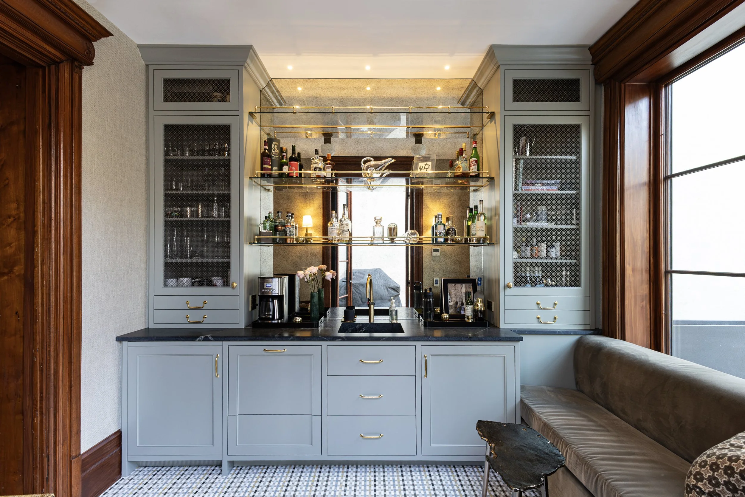 Material clarity drives the redesign. Natural stone anchors the kitchen and bar areas, paired with warm toned cabinetry and brass hardware that will develop a patina over time. Soft, integrated lighting highlights textures and architectural edges, giving the rooms depth without overpowering them. The kitchen was relocated to the former dining room, allowing that space to become a dedicated butler’s pantry. On the opposite side, new French doors connect the a newly created deck, extending the living space outdoors and linking daily activity with a larger entertaining area.